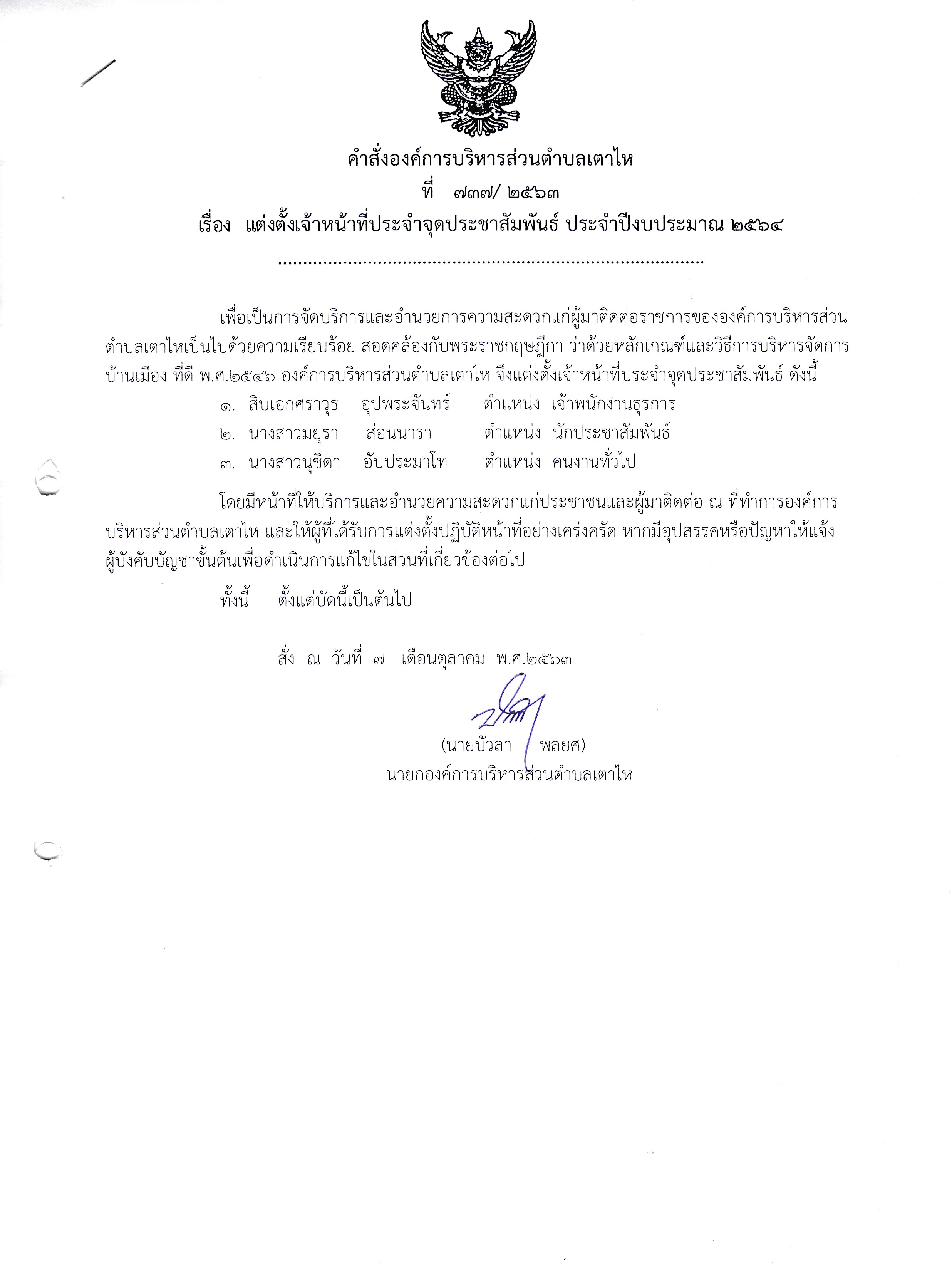 แต่งตั้งเจ้าหน้าที่ประจำจุดประชาสัมพันธ์ ประจำปีงบประมาณ ๒๕๖๔