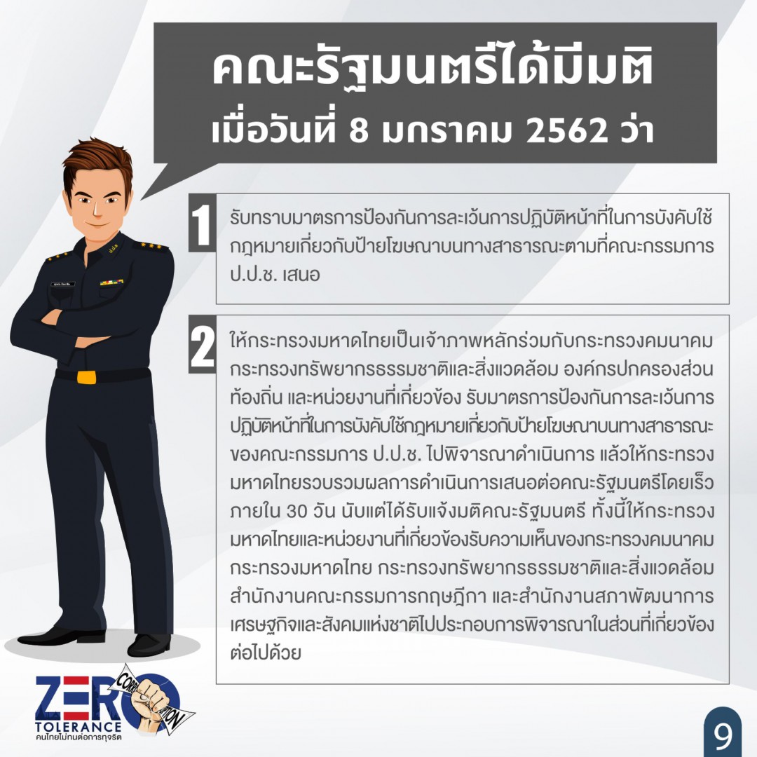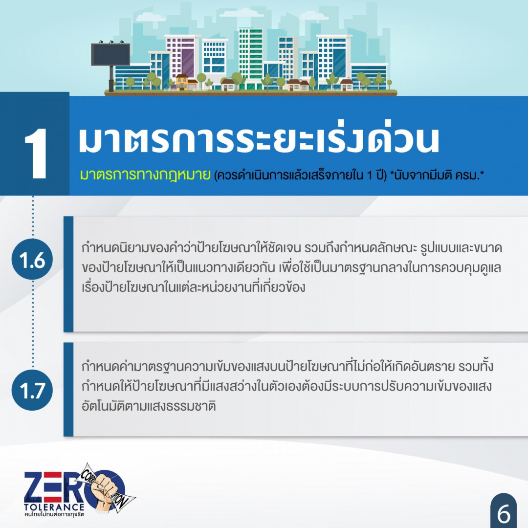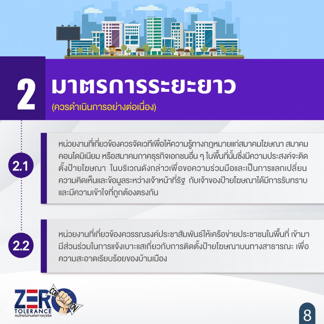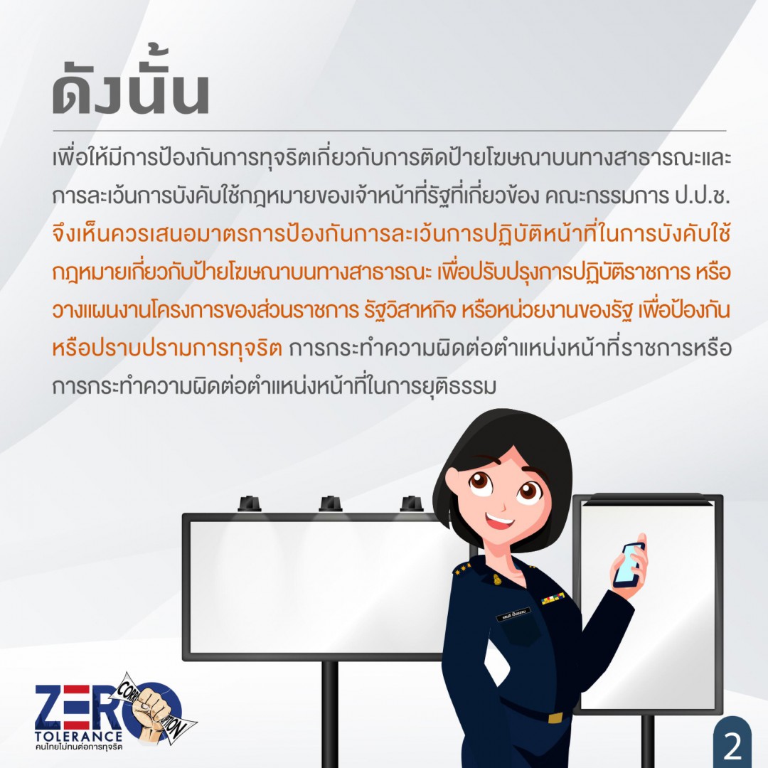 รายละเอียด : าตรการป้องกันการละเว้นการปฏิบัติหน้าที่ในการบังคับใช้กฎหมายเกี่ยวกับป้ายโฆษณาบนทางสาธารณะ มาตรการป้องกันการละเว้นการปฏิบัติหน้าที่ ในการบังคับใช้กฎหมายเกี่ยวกับป้ายโฆษณาบนทางสาธารณะซึ่งเป็นมาตรการเพื่อปรับปรุงการปฏิบัติราชการหรือวางแผนงานโครงการของส่วนราชการ รัฐวิสาหกิจหรือหน่วยงานของรัฐ เพื่อป้องกันหรือปราบปรามการทุจริตและกระทำความผิดในกรณีต่าง ๆ ที่เกี่ยวข้องกับการบังคับใช้กฎหมายเกี่ยวกับป้ายโฆษณาบนทางสาธารณะของเจ้าหน้าที่รัฐที่เกี่ยวข้อง ซึ่งมาตรการฯ แบ่งเป็น 2 ระยะ ดังนี้ มาตรการ / สรุปสาระสำคัญ 1) มาตรการระยะเร่งด่วน 1.1) มาตรการทางการบริหาร ที่ควรดำเนินการเสร็จภายใน 6 เดือน เช่น (1) ป้ายโฆษณาทุกประเภทต้องมีเลขทะเบียนควบคุมเป็นระบบเดียว ซึ่งบ่งบอกหน่วยงานผู้ออกใบอนุญาตหรือกำกับดูแล เพื่อให้เกิดความเข้มงวดในการกำกับดูแล และจัดระเบียบ (2) หน่วยงานที่เกี่ยวข้องควรจัดให้มีช่องทางที่เหมาะสมสำหรับแจ้งเบาะแสป้ายโฆษณาหรือสิ่งอื่นใดที่รุกล้ำทางสาธารณะหรือไม่ชอบด้วยกฎหมาย รวมทั้งมีแนวทางการจัดการที่ชัดเจนและรายงานผลการดำเนินการภายหลัง 1.2) มาตรการทางกฎหมาย ที่ควรดำเนินการเสร็จภายใน 1 ปี เช่น (1) กำหนดนิยามของคำว่าป้ายโฆษณาให้ชัดเจน รวมถึงกำหนดลักษณะ รูปแบบ และขนาด ของป้ายโฆษณาให้เป็นแนวทางเดียวกัน เพื่อใช้เป็นมาตรฐานกลางในการควบคุมดูแล (2) กำหนดค่ามาตรฐานความเข้มของแสงบนป้ายโฆษณาที่ไม่ก่อให้เกิดอันตราย และ (3) ปรับปรุงอัตราค่าธรรมเนียมการขออนุญาตติดตั้งให้เหมาะสมกับปัจจุบัน 2) มาตรการระยะยาว ควรดำเนินการอย่างต่อเนื่อง โดยควรจัดให้ความรู้ทางกฎหมายแก่สมาคมโฆษณา สมาคมคอนโดมิเนียม หรือสมาคมภาคธุรกิจเอกชนอื่น ๆ ที่มีความประสงค์จะติดตั้งป้ายโฆษณาในพื้นที่ให้มีความเข้าใจที่ถูกต้องตรงกัน และควรรณรงค์ให้เครือข่ายประชาชนเข้ามามีส่วนร่วมในการแจ้งเบาะแสเกี่ยวกับการติดตั้งป้ายโฆษณาบนทางสาธารณะ