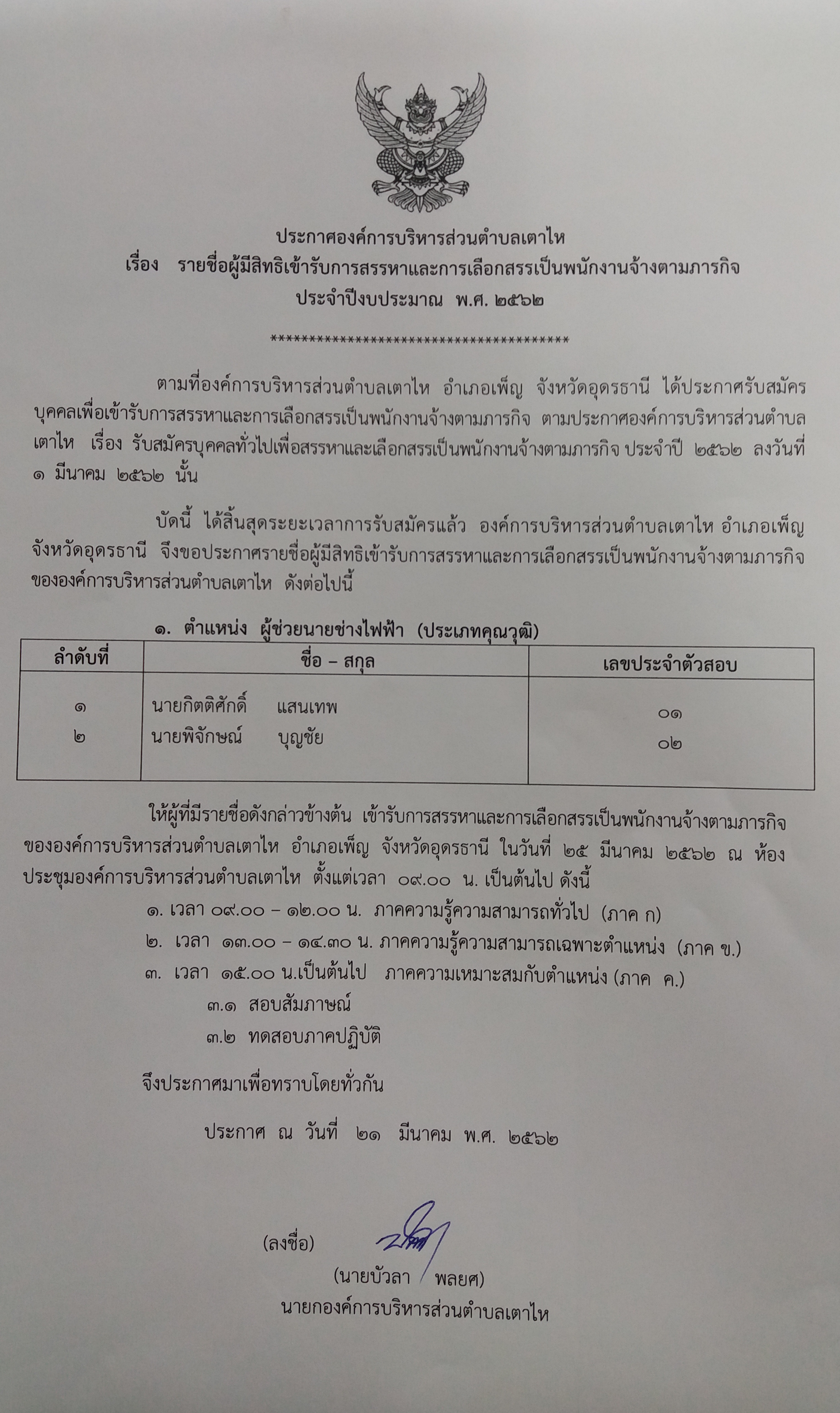 ประกาศ เรื่อง รายชื่อผู้มีสิทธิ์เข้ารับการสรรหาและการเลือกสรรเป็นพนักงานจ้างตามภารกิจ ประจำปีงบประมาณ 2562