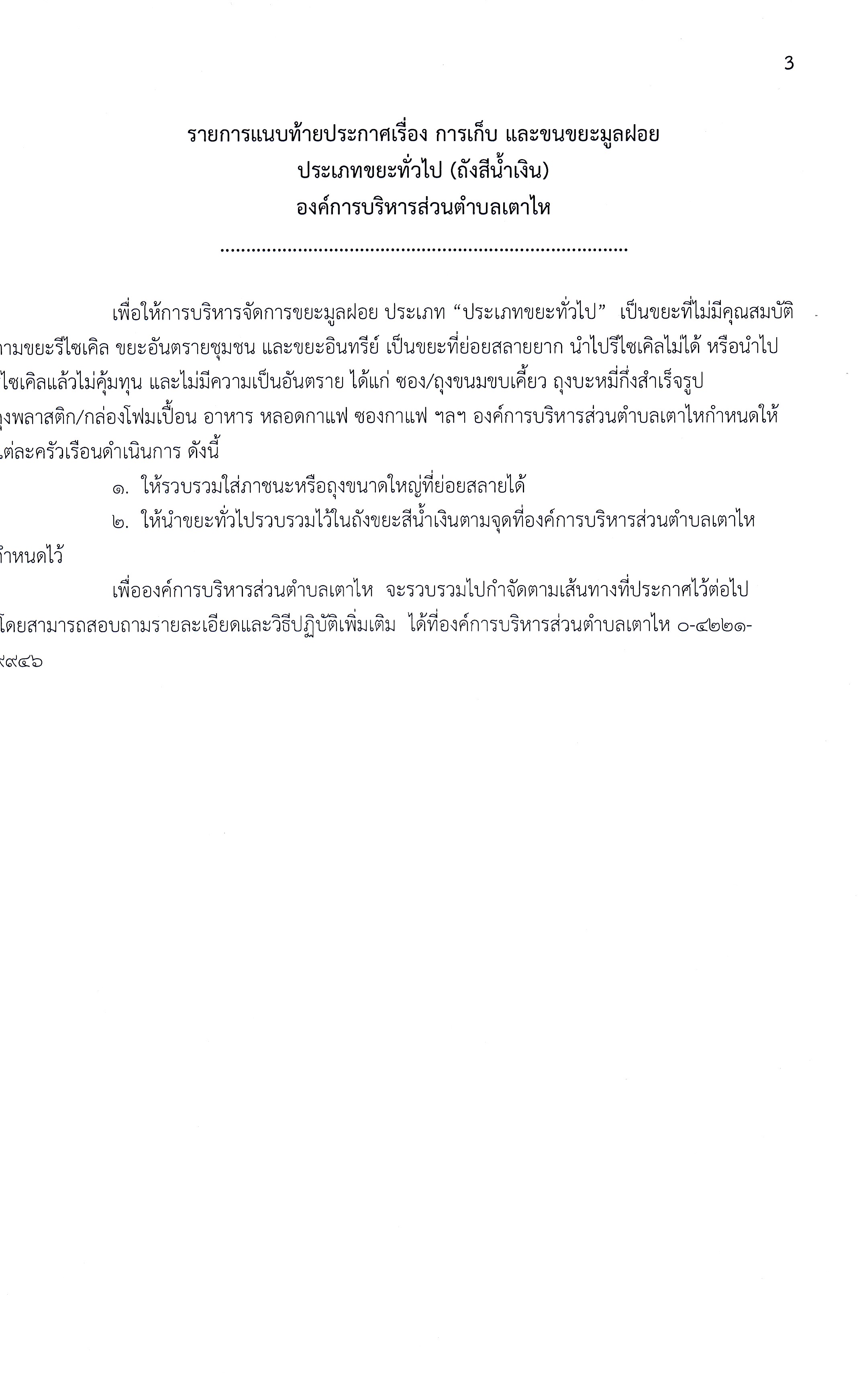 ประกาศ เรื่อง การเก็บและขนขยะมูลฝอย
