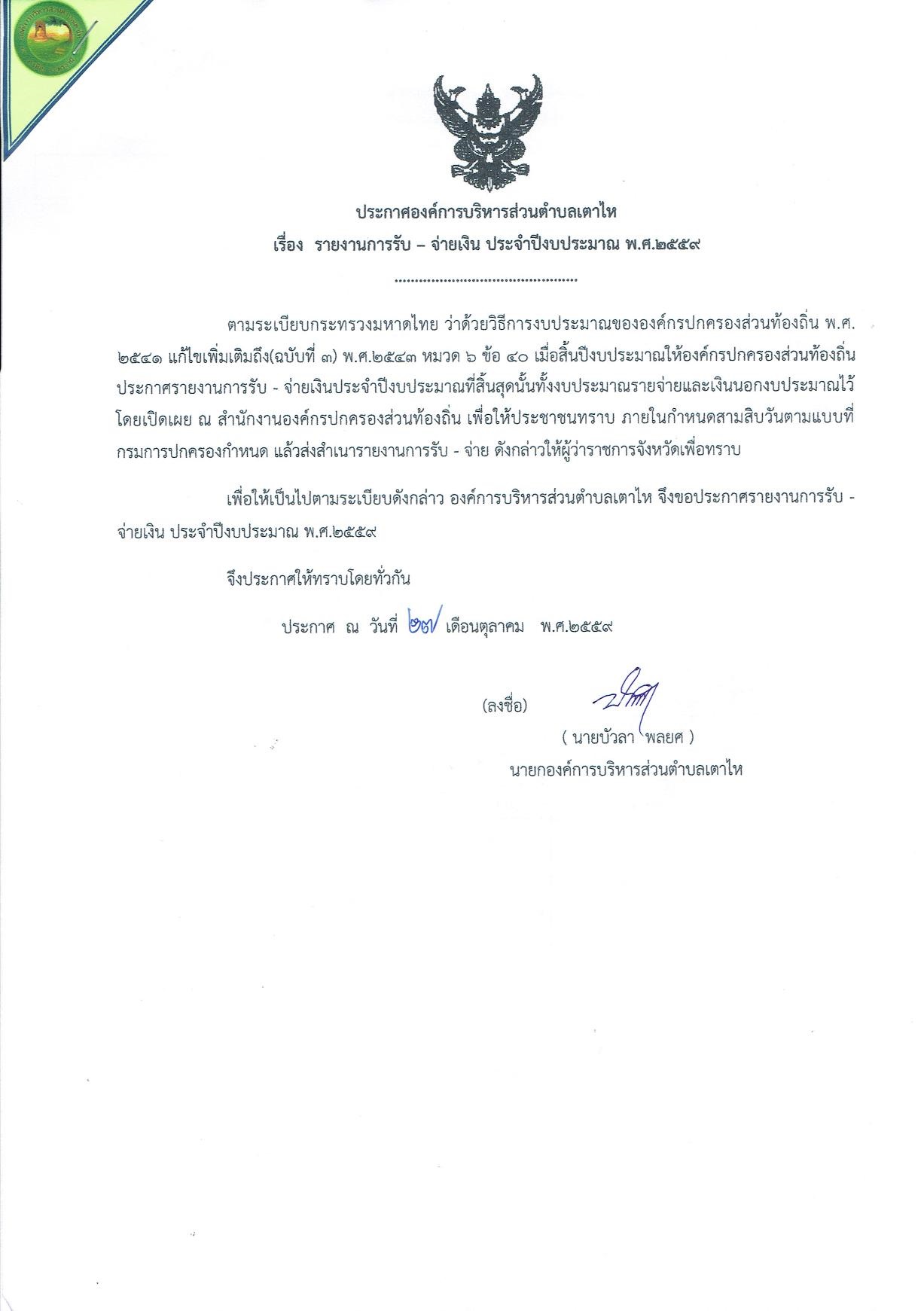 รายงานการรับ-จ่ายเงิน ประจำปีงบประมาณ ๒๕๕๙